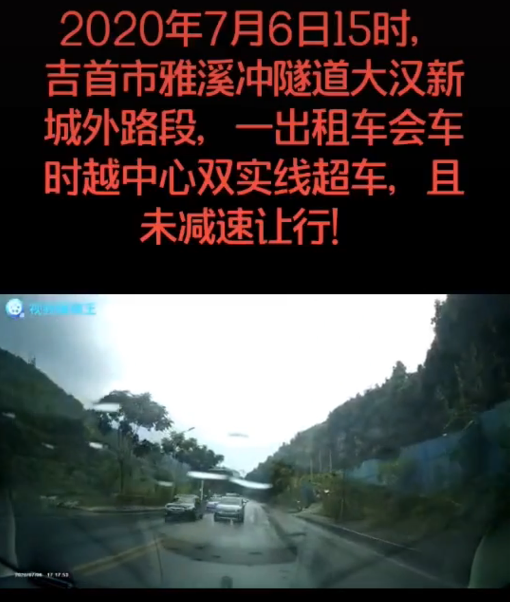 7月10日,吉首市公安局交通管理大队接到湘西交警支队转发的一条网友举报视频,网友在抖音中用文字描述道:“2020年7月6日15时,吉首市雅溪冲隧道大汉新城外路段,一出租车会车时越中心双实线超车,且未减速让行!”从视频中可见,车牌为湘UX9*** 的车辆压双黄线强行超车。
