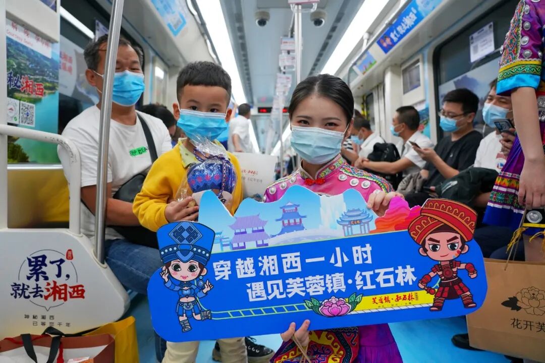 “穿越湘西一小时,遇见芙蓉镇·红石林,欢迎乘坐湘西旅游专列……”身着土家族服饰的阿哥阿妹在地铁上给市民介绍着湘西芙蓉镇·红石林度假区的美景,派发着来自湘西的文创礼物,不知今日乘坐长沙地铁2号线的各位有没有遇见她们?