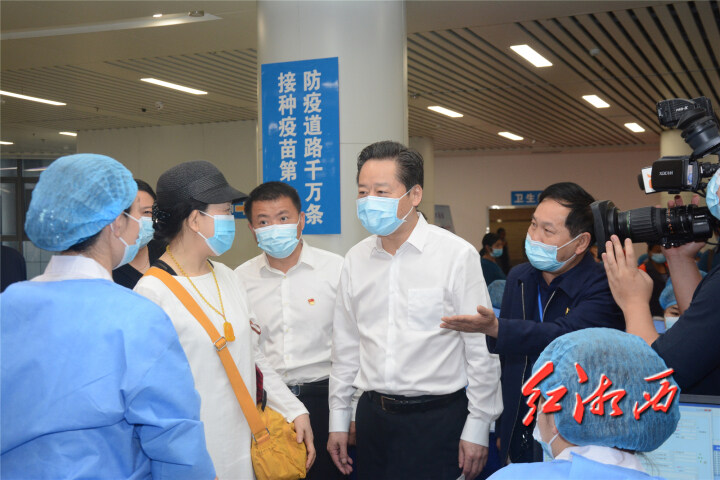 我州首个大型方舱式新冠肺炎疫苗接种点由州市共建,面积超过1000平方米,规划设置接种台20个,近百名工作人员为群众提供服务,并成立了方舱接种点临时党支部和3个工作组,每天接种量4000剂次以上。虢正贵察看登记区、接种区、医疗保障区,详细了解设施设备、接种能力、疫苗管理及应急处置等情况。他强调,各级各部门要高度重视新冠肺炎疫苗接种工作,科学统筹协调,广泛宣传发动,引导群众积极接种疫苗,稳妥有序、全力加快疫苗接种工作,落实好常态化疫情防控的各项措施。
