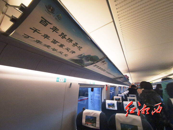 仪式结束后,来自全国各地的游客兴致盎然地进入到这首趟冠名高铁,他们在列车就开始体验别样的湘西风情,纷纷拿出手机拍照、打卡。