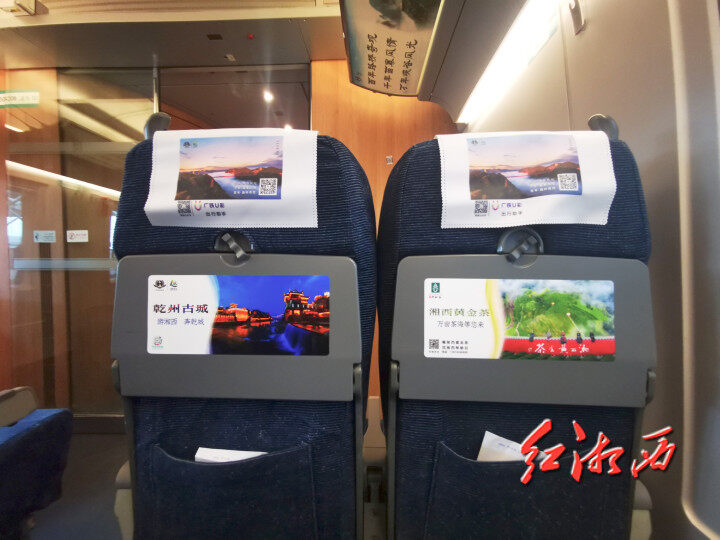 记者在现场看到,冠名的列车的车身有“矮寨·十八洞·德夯大峡谷”字样,每节车厢张贴海报,展示百年路桥奇观、千年苗寨风情、万年峡谷风光等,列车车内采用语音播报、跑信息屏、玻璃门贴、枕巾、桌贴、海报、行李架彩贴等共多种媒体形式展示矮寨·十八洞·德夯大峡谷景区风光,座位头枕巾上印有景区微信公众号、官方微博二维码。