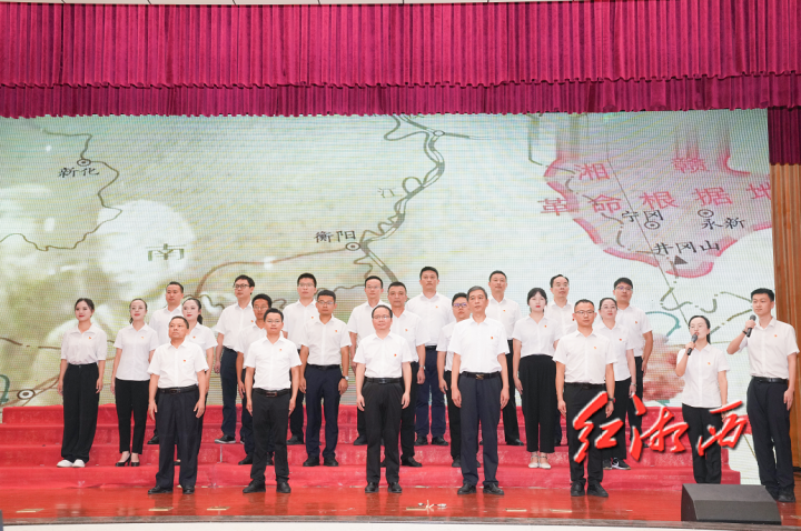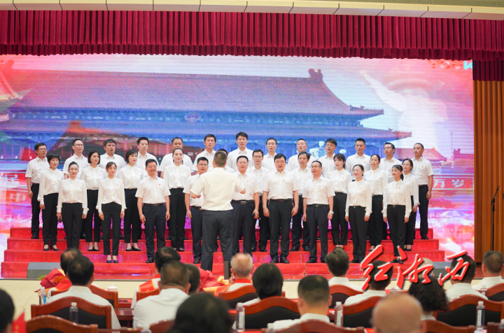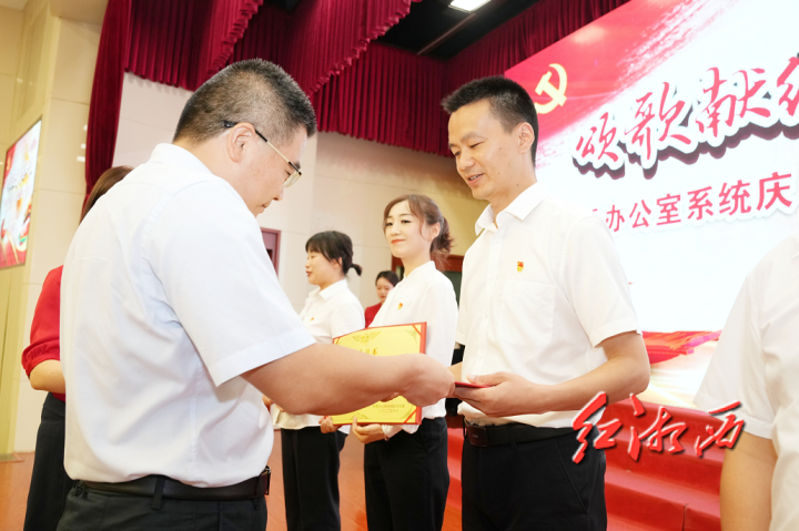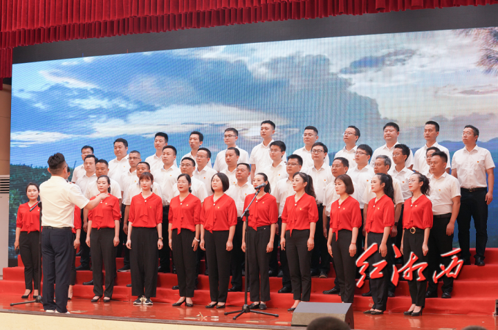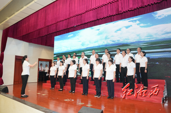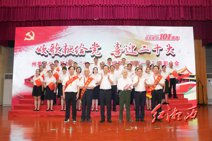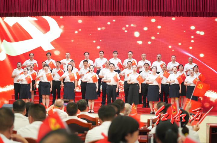 “我志愿加入中国共产党,拥护党的纲领,遵守党的章程……”大会一开始,州委办公室系统党员干部全体起立歌唱《我宣誓》,对党许下不悔誓言,表达为共产主义事业奋斗终身的坚定决心。随后,党员干部们演唱了《唱支山歌给党听》《我的祖国》《红星闪闪》《在灿烂阳光下》《让党旗高高飘扬》等一首首感人歌曲,用歌声表达了对党的热爱,唱出了永远跟党走的坚定信念。大会还表彰州委办公室系统优秀共产党员、优秀党务工作者及先进基层党组织,号召系统各党支部和党员同志以先进为榜样,不忘初心、牢记使命,勇于担当、主动作为,以一流的能力素质、一流的工作作风、一流的服务水平,不断推动“三服务”工作高质量发展。大会最后,全体起立高唱 《没有共产党就没有新中国》,深情献礼建党101周年。
