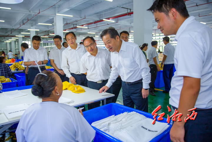 虢正贵走进安置区振兴车间——凤凰县咏昌达手袋公司,和在这里上班的搬迁群众亲切交流,关切询问他们的家庭生活、收入来源、子女上学等情况,勉励他们安心工作,通过自己的双手勤劳致富。在同企业负责人座谈交流时,虢正贵鼓励企业增强民本情怀、担当社会责任,坚定信心、稳中求进,对接市场、扩大规模,带动更多搬迁群众稳定就业、持续增收。他要求有关部门主动上门服务,加强对接协调,落实惠企政策,稳定市场主体,助力企业做大做强。