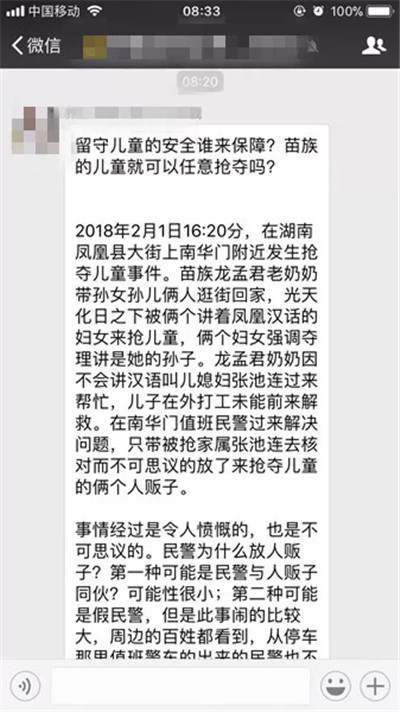 2月1日,一则“人贩子街上当众抢小孩”的视频在凤凰当地朋友圈、微信群疯传,并配有当事人现身说法和部分评论信息。一时间,该信息引发一些网友转发,在社会上造成了一定影响,引起很多不明真相市民、家长的恐慌。警方通过调查确认:此消息系谣言!原来是79岁的老人认错了孙子。