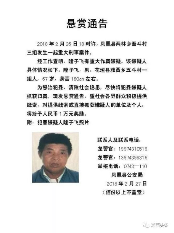 为惩治犯罪,消除社会隐患,凤凰县公安局正组织警力兵分多路,对犯罪嫌疑人可能藏匿的地点和逃跑路线进行全面布控,安排人员24小时守卡拦截,同时动用“一村一警”,广泛发布悬赏通告征集线索。
