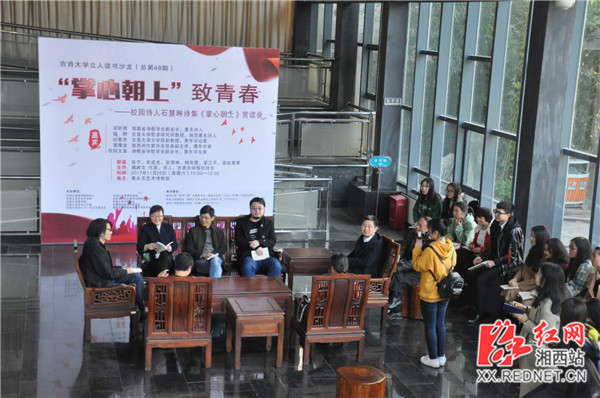 红网时刻11月28日讯(通讯员 许乐清)11月25日上午,湘西州吉首大学风雨湖畔的黄永玉博物馆里,来了一群热爱的诗歌的人们,他们正在赏读校园诗人石慧琳的诗集《掌心朝上》。他们中有湖南省诗歌学会副会长吴昕孺、诗人胡建文以及众多校内外文艺爱好者,他们对石慧琳表现出来的才情和努力无不赞赏。