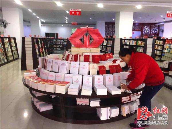记者走进湘西州新华书店内,发现在一楼大厅最显眼的位置,专门设立了十九大文件及学习辅导读物专台,集中展示党的十九大报告、《中国共产党章程》、《党的十九大报告辅导读本》、《中国共产党第十九次全国代表大会文件汇编》等。据新华书店湘西分公司图书业务部王宁介绍,不仅是湘西州新华书店,还是各县区的新华书店都在门店最显眼的位置进行集中陈列十九大学习辅导读物,通过集中展示,集中陈列,给读者集中介绍学习十九大精神。当记者问在工作中对十九大召开有何深刻体会时,他对记者说:“自十九大召开以来,最让我感到惊喜的是现在普通老百姓也是非常关注十九大精神的学习,在我们新华书店零售期间共销售党的十九大相关读物近4000册,相较其他读物来说是非常畅销的。”