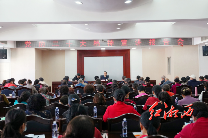 随后,在该校多媒体会议室举行党的二十大精神宣讲报告会。虢正贵说,学习宣传贯彻党的二十大精神,是当前和今后一个时期全党全国的首要政治任务,每名党员干部都有责任和义务把大会精神学习好贯彻好。各位老干部在全州党员干部中地位特殊、影响较大,是很多人关注的对象和学习的榜样,大家学习党的二十大精神的热度、深度,对于提高全州深学笃行党的二十大精神的成效很重要。虢正贵通过自己参加党的二十大的亲身经历和切身感受,与大家分享了会议盛况,并结合自己的学习思考,与大家交流学习体会,深入浅出地阐述了党的二十大的重大意义、丰富内涵、精神实质。他说,大会标注了新起点,向党内外、国内外鲜明宣示,中国共产党和中国人民在新征程上举什么旗、走什么路、以什么样的精神状态、朝着什么样的目标继续前进;大会发展了新思想,开辟了马克思主义中国化时代化新境界;大会明确了新使命,阐明了中国式现代化的中国特色、本质要求、重大原则,明确了全面建成社会主义现代化强国的“两步走”战略安排;大会作出了新部署,围绕统筹推进“五位一体”总体布局、协调推进“四个全面”战略布局,明确了未来五年党和国家事业发展的大政方针;大会凝聚了新力量,大家对过去五年工作和新时代取得的伟大成就高度评价,对党的二十大作出的重大决策部署坚决拥护,对奋进新征程、夺取新胜利满怀豪情。