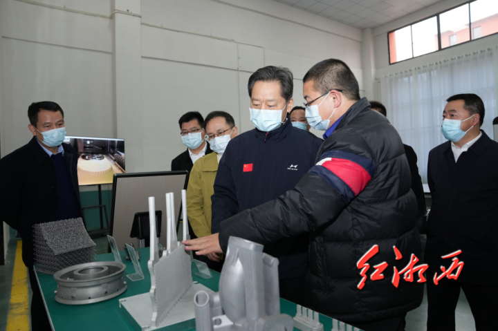 在奥科公司,虢正贵参观了800 吨/年激光熔覆新增材制造高性能合金粉体材料生产线作业、原材料及成品展示,详细了解企业在生产、包装、销售、技术创新、人才引进、市场开拓等方面的情况。虢正贵与企业负责人交流时说,要明确发展定位,优化发展思路,立足地方实际和自身发展优势,培育自主创新能力,不断提高核心竞争力,进一步把企业做大做强。相关职能部门要进一步增强服务意识,持续优化营商环境,为企业提供精准政策支持和周到贴心服务,及时为企业纾困解难,助力企业加快发展、健康发展。