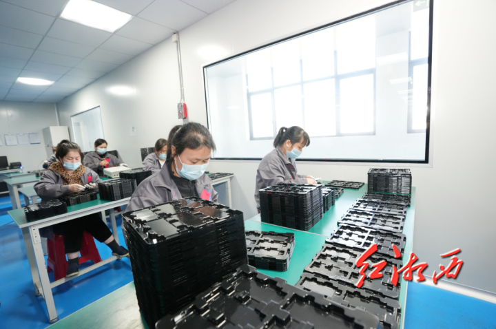 奥邦新能源科技有限公司年产3.36亿Ah聚合物锂离子电池生产线上忙碌的工人。