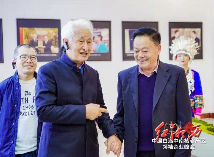 来吉首参加峰会的中国白酒著名专家、贵州茅台酒厂原董事长季克良(左)与酒鬼酒创始人、湘泉药业党委书记王锡炳(右)交流。