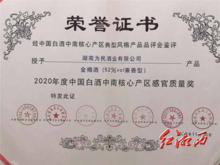 红网时刻湘西11月22日讯(团结报记者 龙尧)11月20日,2020第二届中国白酒中南核心产区领袖企业峰会在吉首市举行,记者从会上获悉,湘泉药业股份有限公司全资子公司湖南为民酒业有限公司金樽酒产品获“2020年度中国白酒中南核心产区感官质量奖”。
